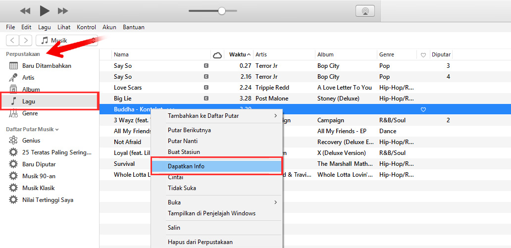 1. Buka iTunes, pergi ke kolom “perpustakaan” pilih menu “lagu” Setelah masuk di menu “lagu” pilih lagu yang ingin di jadikan nada dering. Klik kanan pada lagu tersebut, klik menu “dapatkan info”.