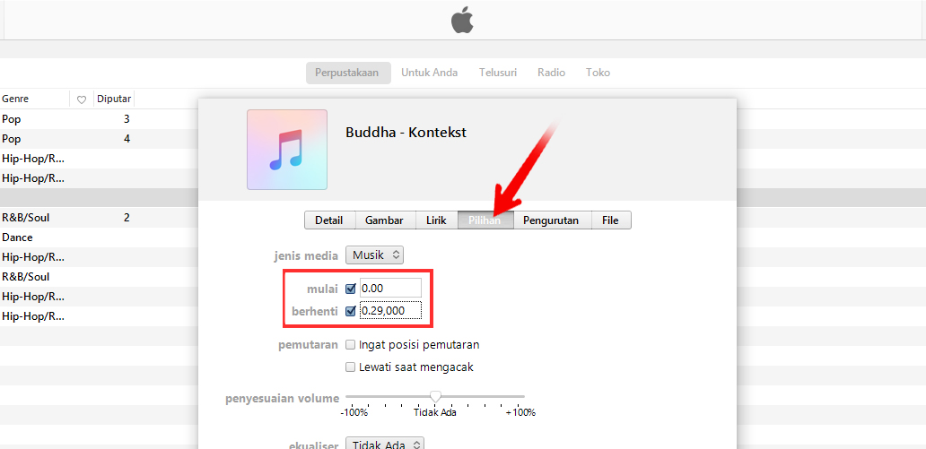 2. Setelah itu pilih menu “pilihan”, di menu “pilihan” ada kolom “mulai” dan kolom “berhenti”, kolom “mulai” dimaksudkan untuk menit ke berapa lagu tersebut mulai dan kolom “berhenti” untuk kapan lagu tersebut berhenti.