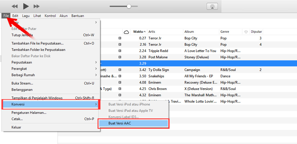 3. Klik lagu yang sudah di edit durasi nya, lalu klik menu “File” dan pilih menu “konversi” kemudian pilih menu “buat versi AAC”