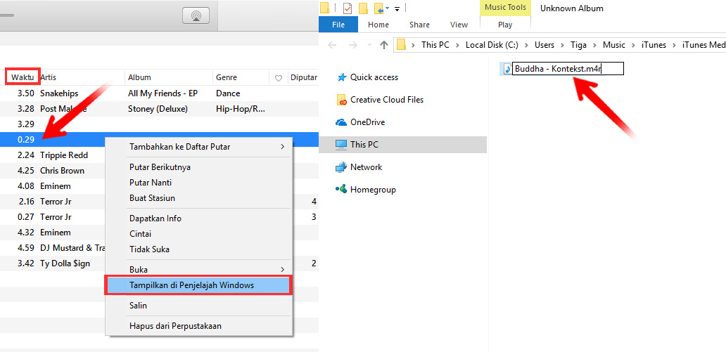 4. Bila sudah ketemu, klik kanan di lagu tadi, pilih menu “tampilkan di penjelajah windows”. Windows explorer akan terbuka, kamu ubah format lagu tersebut dari “m4a” ke “m4r”. Sekedar info, “m4r” itu format nada dering untuk perangkat iOS.