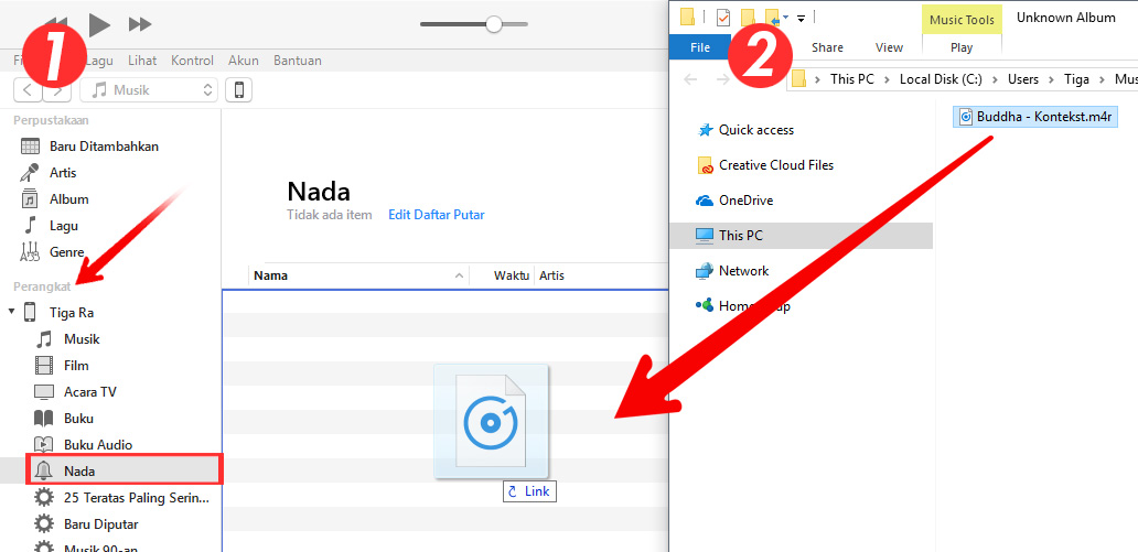 5. (pindahkan nada dering tadi ke perangkat iOS kamu) Sambungkan perangkat iOS ke komputer/laptop, pilih menu “perangkat” lalu klik menu”nada” di iTunes. Buka lagi windows explorer yang berisi nada dering tadi.