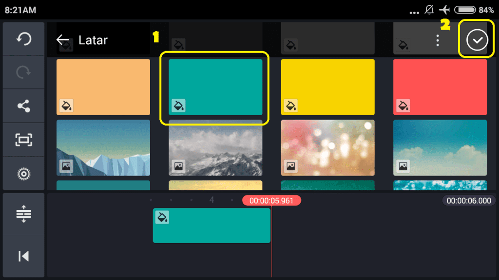 3. Kamu dapat memilih background video, foto keren kamu, atau background bawaan dari KineMaster. Disini saya akan menggunakan background bawaan dari KineMaster. Klik centang ketika sudah memilih background.