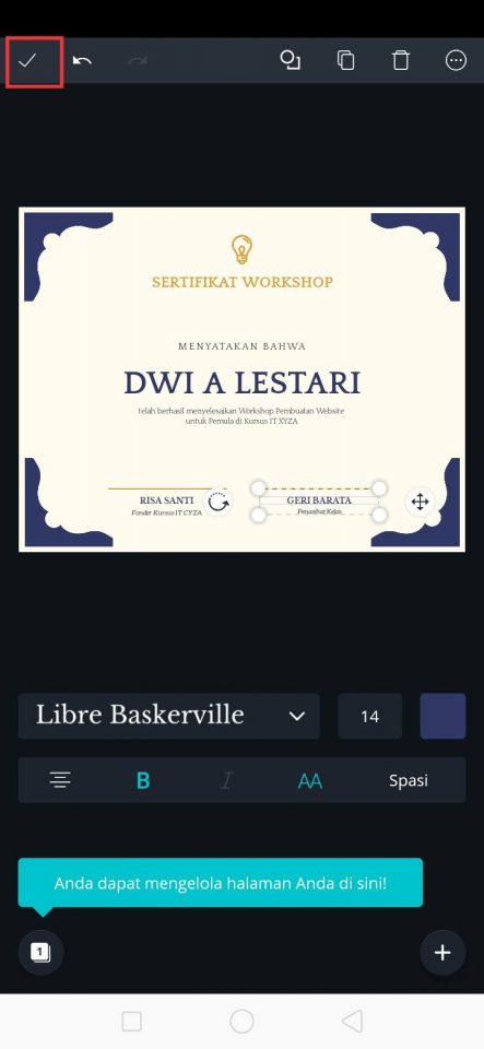 4. Aturlah tampilan desain beserta teks di dalam template sertifikat. Setelah itu, tekan simbol centang.