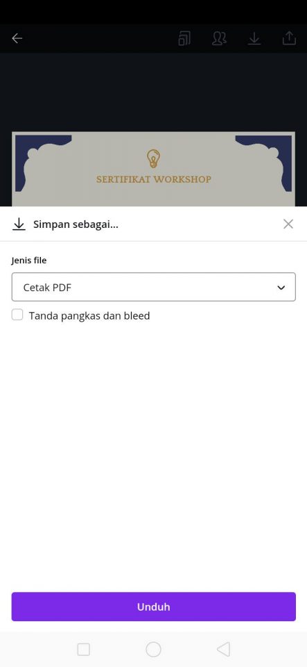 6. Pilihlah Cetak PDF. Hal ini dilakukan agar menyimpan sertifikat dalam bentuk dokumen digital PDF yang berguna untuk mencetak dalam bentuk kertas. Setelah itu, tekan Unduh.