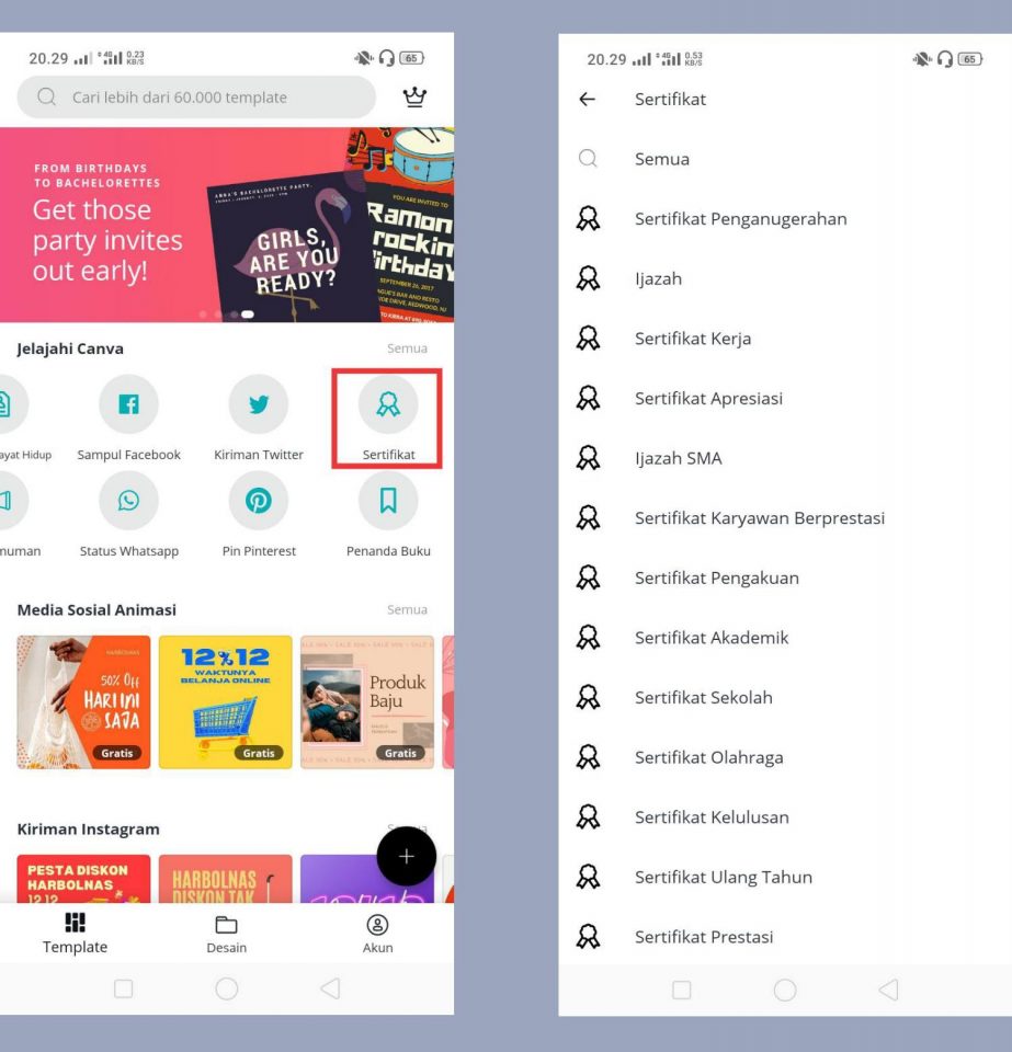 2. Geserkan ke kanan pada bagian Jelajahi Canva, tekan Sertifikat. Kemudian, pilihlah Sertifikat yang dibutuhkan.