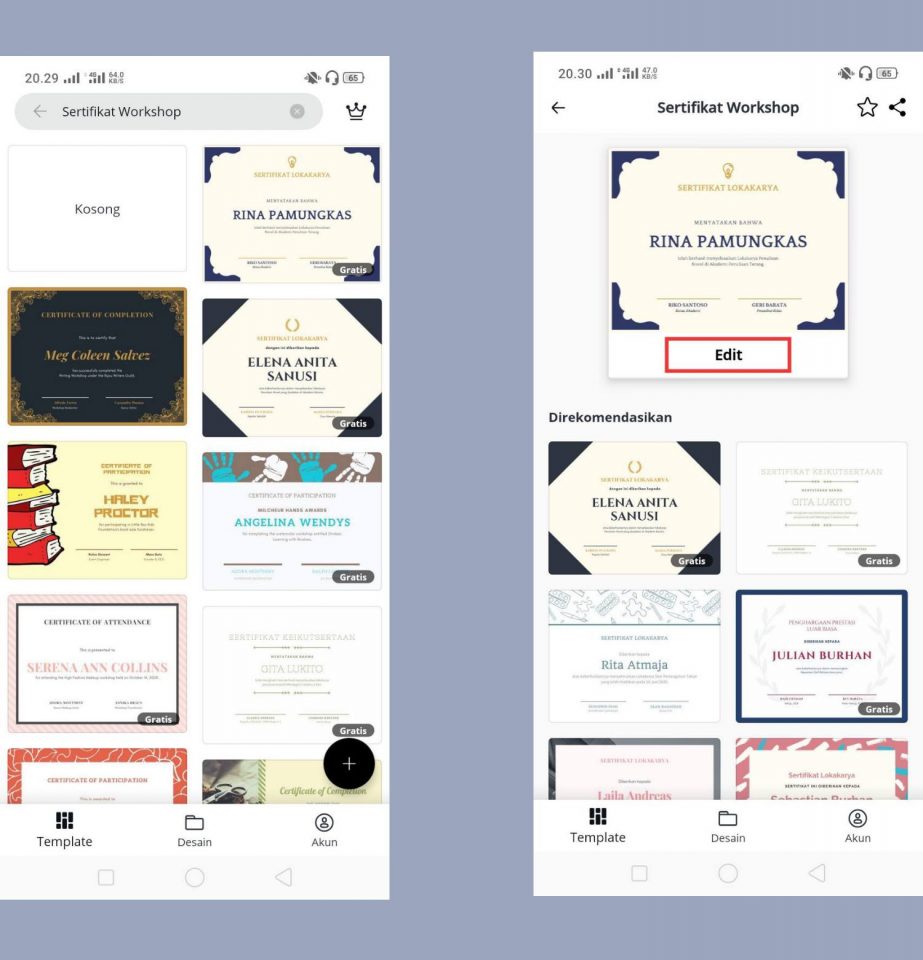 3. Pilihlah tampilan template sertifikat yang dibutuhkan dan tekan Edit.