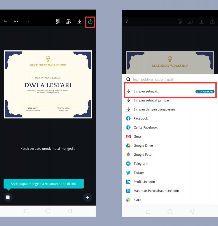 Jadi, kamu bisa membuat sertifikat sendiri dengan menggunakan aplikasi Canva yang terpasang di Android tanpa harus memiliki keahlian dunia multimedia atau desain grafis. Canva inilah telah memberikan kemudahan dalam pembuatan suatu produk dalam bentuk seni dan media visual atau animasi (video) yang bisa menghasilkan suatu produk desain dalam waktu yang relatif singkat.