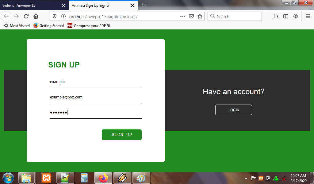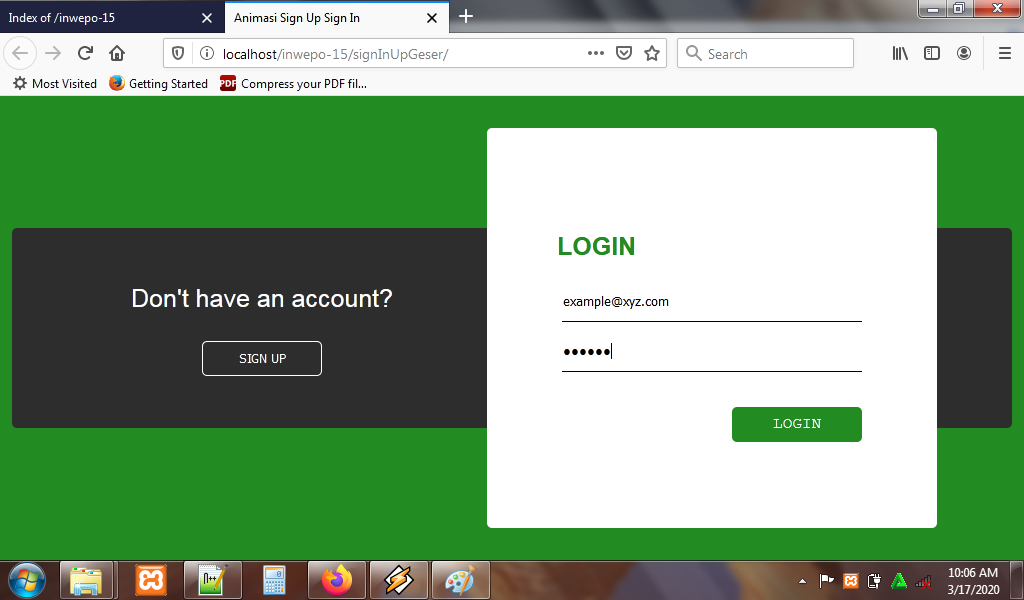 8. Reload alamat url : http://localhost/SliderForm. Klik tombol sign up untuk memunculkan form sign up.