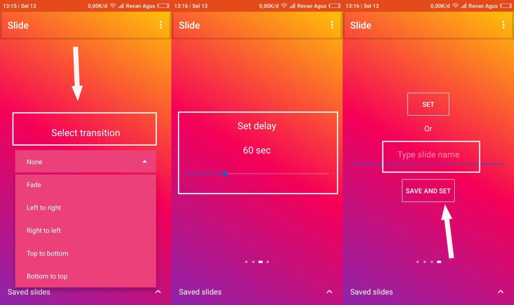 4. pilih Select transition untuk mengatur efek perpindahan dari gambar satu ke gambar yang lain. Berikutnya atur waktu atau Set delay sesuai keinginan. Lalu beri nama pada tampilan Slide dan pilih SAVE AND SET.