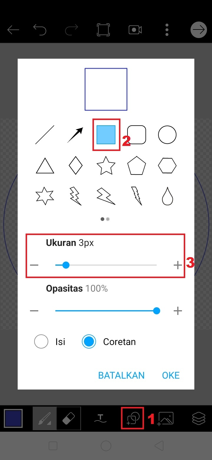 13. Klik ikon ‘Snape’ – pilih bentuk persegi – atur tebal persegi – klik ok.