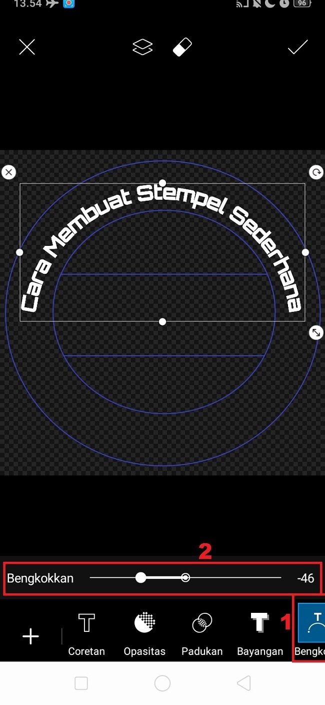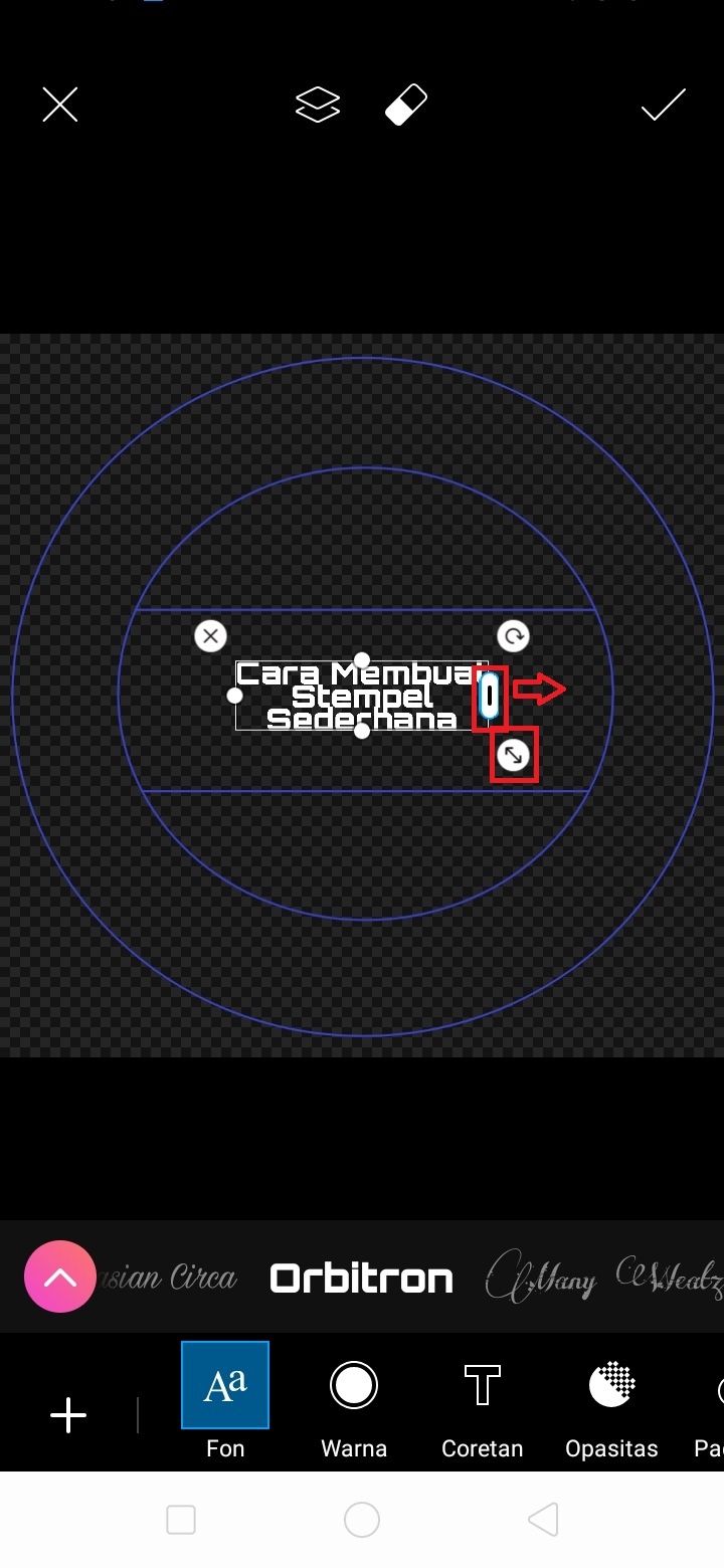 Klik ikon ‘Bengkok’ dan tambah nilai untuk membuat teks bengkok ke bawah. Letakkan teks di antara lingkaran bagian bawah. Klik ikon ‘+’ untuk menambah teks.