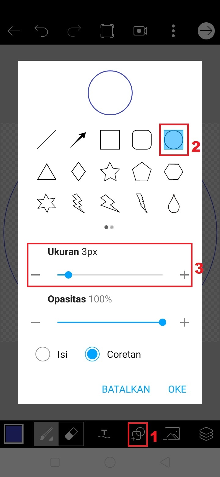 6. Klik ikon ‘Snape’ – pilih bentuk lingkaran – atur tebal lingkaran – klik ok.