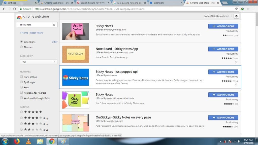 4. Setelah itu, ketikkan “Sticky Notes” di kotak pencarian – Tekan Enter. Kemudian, carilah ekstensi yang bernama Sticky Notes – Just popped up! – Klik tombol ADD TO CHROME.