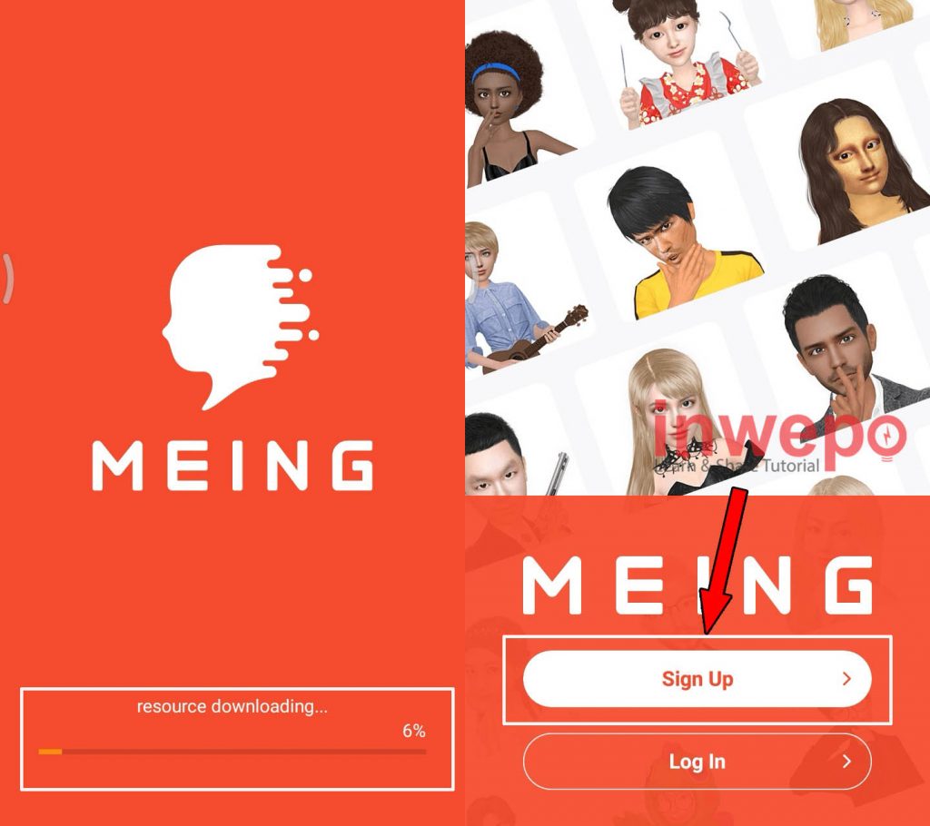 2. Buka aplikasi MEING dan tunggu proses resource download hingga selesai. Berikutnya tap Sign Up untuk mendaftar di aplikasi MEING jika sudah bisa langsung masuk menggunakan menu Log in.