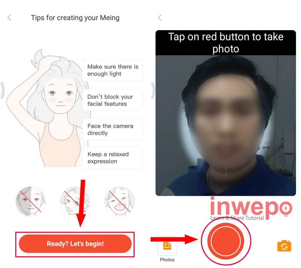 3. Tap Ready? Let’s Begin! kemudian kamu akan diarahkan ke kamera untuk mengambil foto. Sejajarkan wajah dengan garis tegak lurus yang ada di tengah agar simetris, dan jika sudah tap tombol shutter berwarna merah.