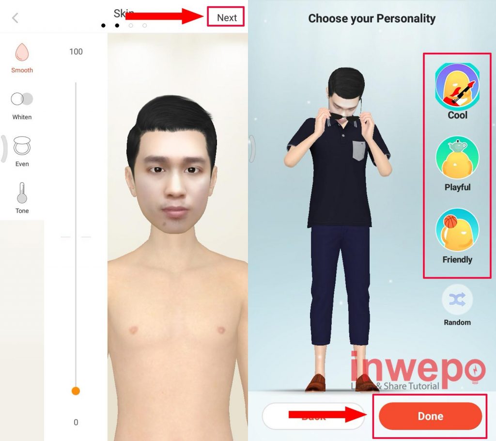 4. Atur warna kulit bentuk wajah sesuai yang kamu inginkan lalu tap Next. Selanjutnya pilih Personality kemudian tap Done.