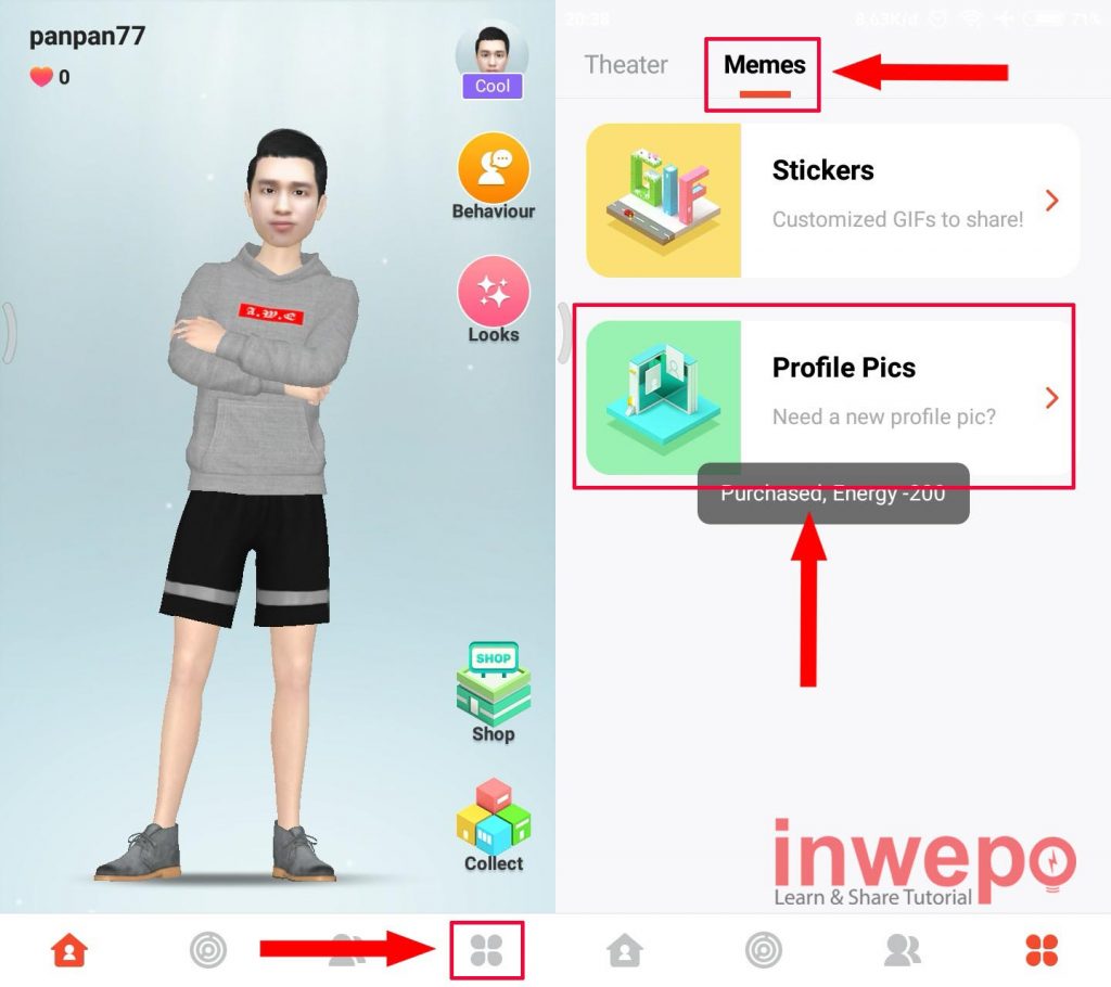 5. Tap icon yang berada di pojok kanan bawah, lalu pilih menu Memes kemudian Profile Pics.