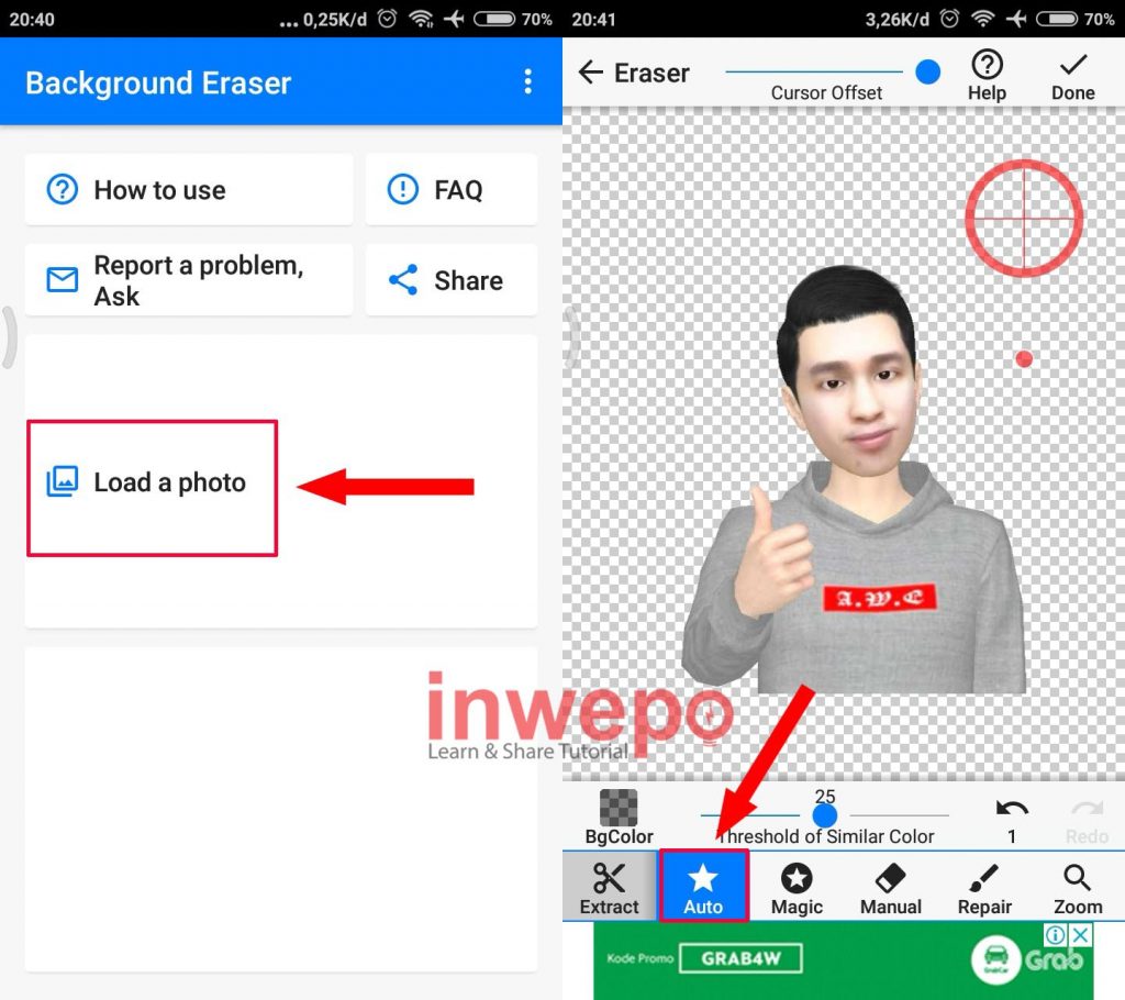 7. Buka aplikasi background eraser lalu pilih Load a photo dan pilih foto dari MEING yang sudah kita simpan sebelumnya. Langsung gunakan menu AUTO dan arahkan pada background untuk menghapus background. Jangan lupa untuk menyimpan hasilnya ke galeri.