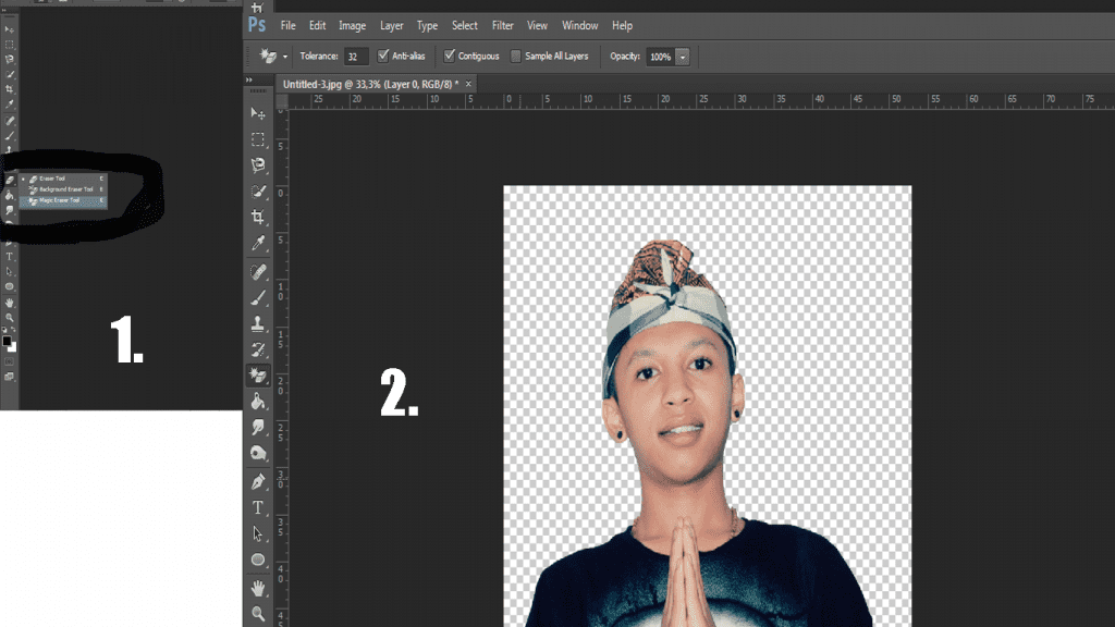 4. Gunakan MAGIC ERASER TOOL untuk menghapus background pada foto. (lihat gambar).