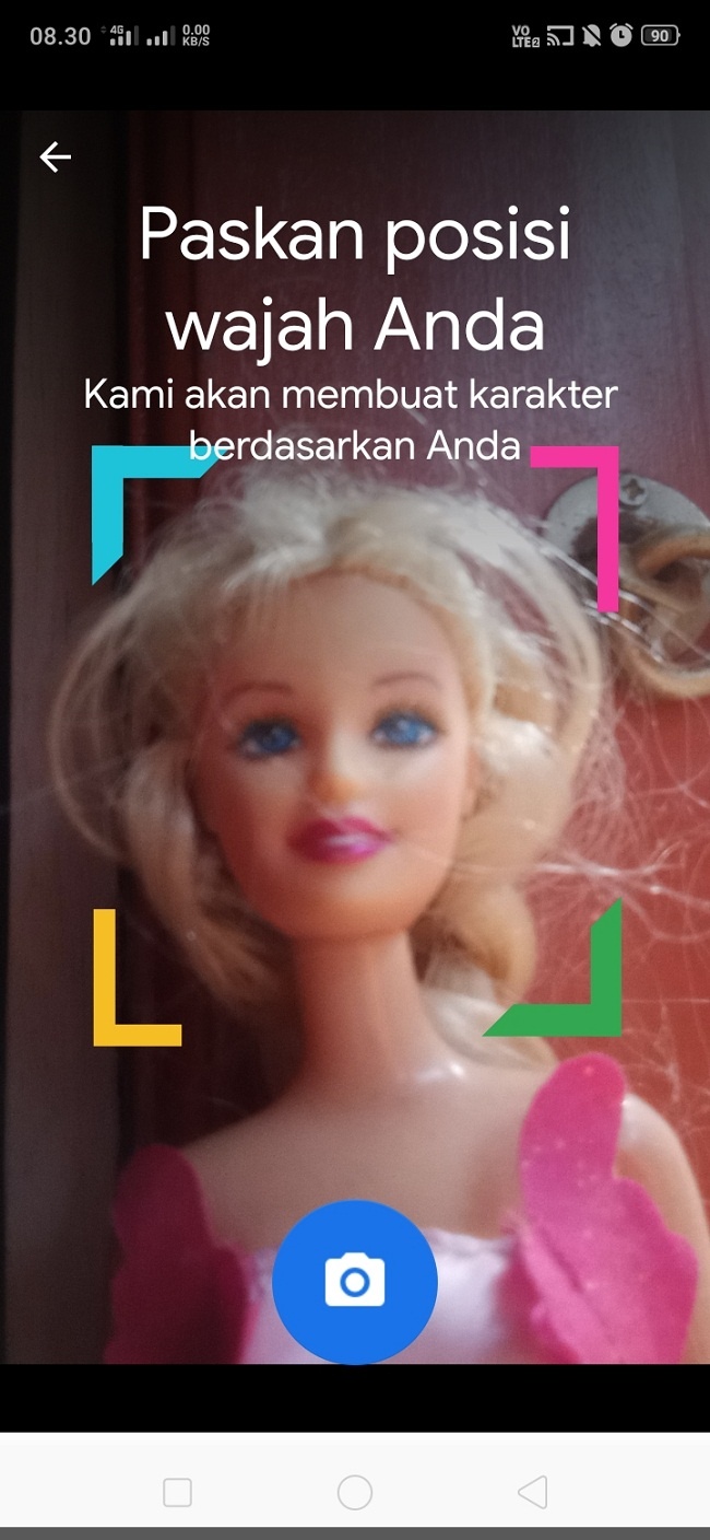 5. Untuk membuat karakter stiker bedasarkan wajah, paskan posisi wajah kamu dalam box. Klik tombol foto untuk mengambail foto.