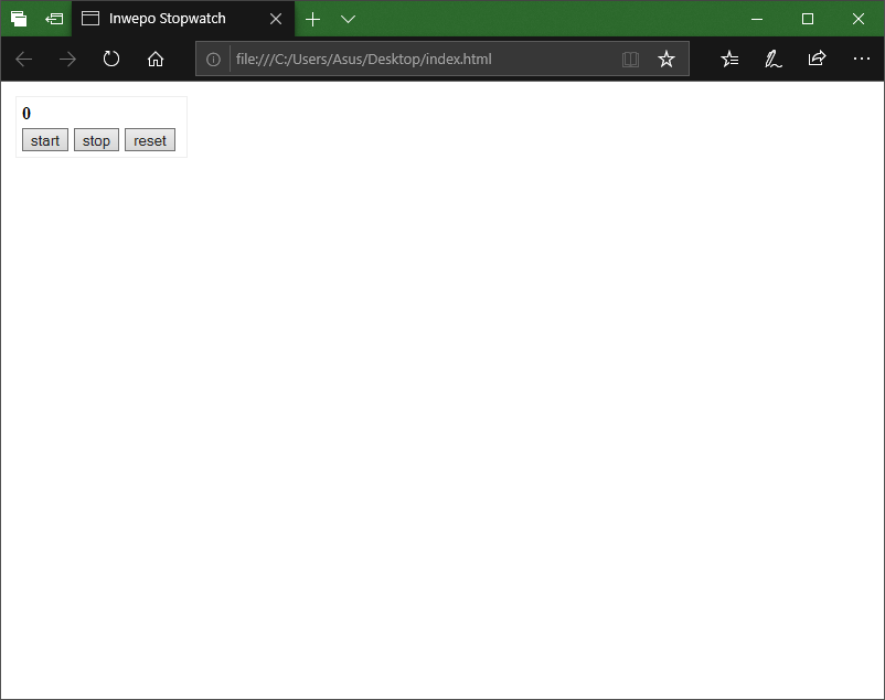 5. Jalankan file index.html melalui browser. Jika berhasil, nantinya akan muncul komponen stopwatch beserta dengan fitur start, stop, dan reset yang dapat kita gunakan.