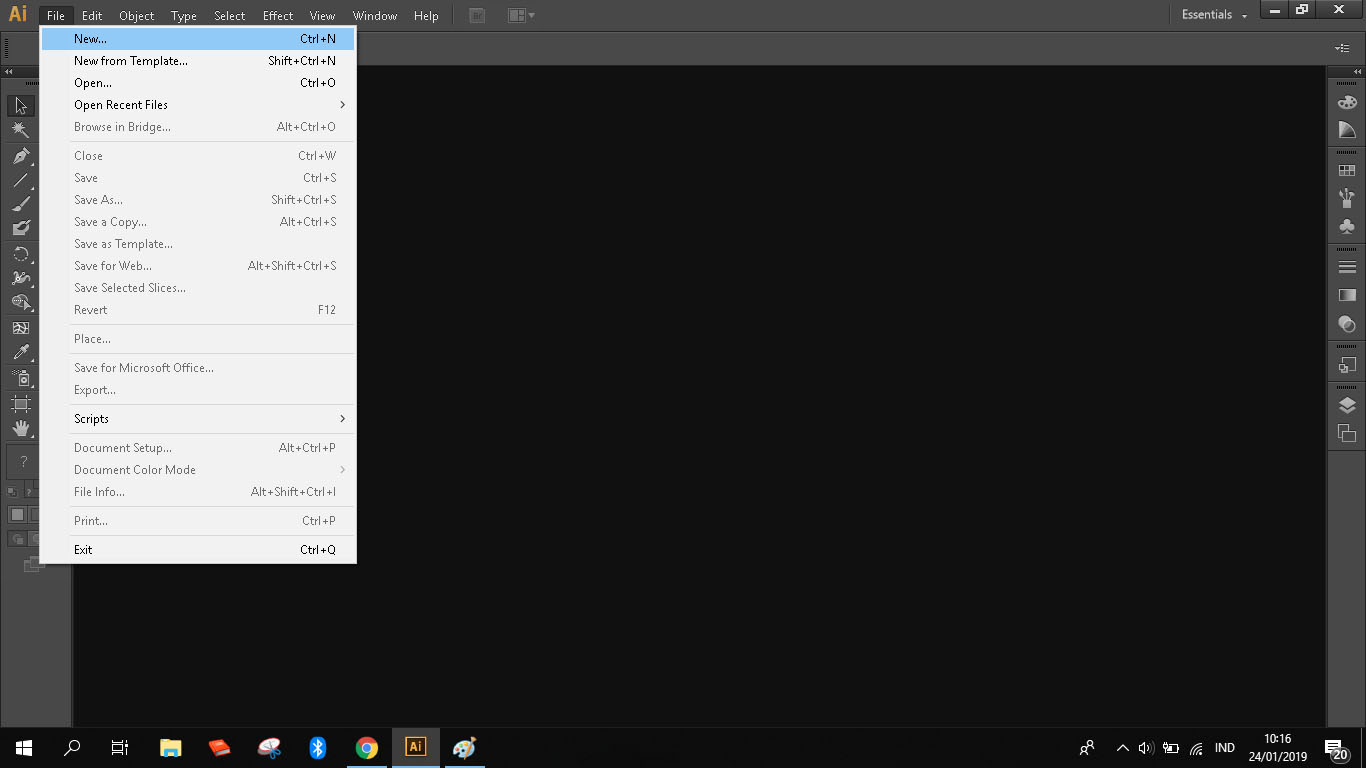 1. Seperti biasanya buka aplikasi Adobe Illustrator kemudian kita dapat memulai dengan membuat lembar kerja baru dengan cara klik file pada menu bar – new atau dapat dengan langsung mengetikkan Ctrl+N pada keyboard.