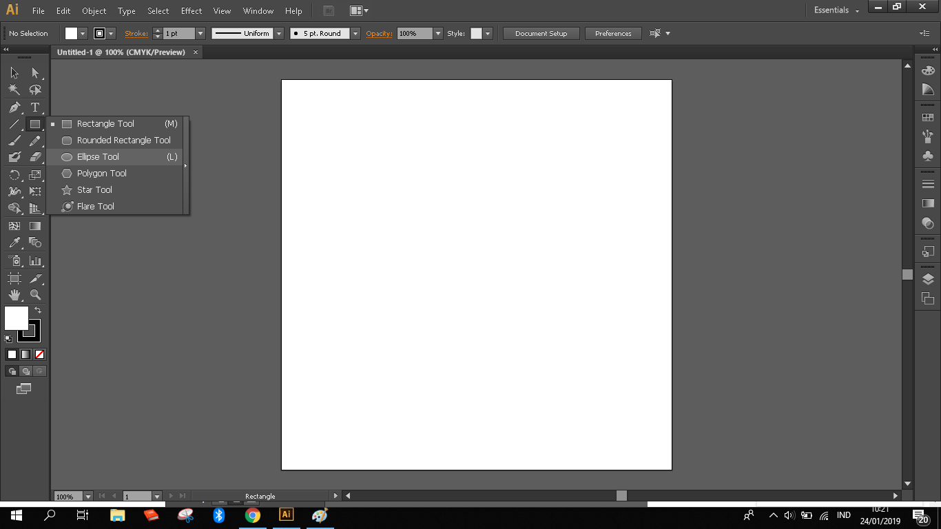 3. Klik Ellipse tool pada toolbox jika pada toolbox semula terdapat pilihan rectangle tool klik dan tekan tool tersebut hingga memunculkan beberapa opsi objek yang lain.