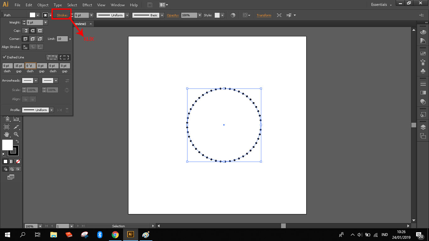 5. Atur stroke lingkaran dengan cara klik stroke pada bagian property bar kemudian akan ada pilihan pengaturan bentuk stroke seperti weight untuk mengatur ketebalan garis, cap untuk menentukan bentuk stroke. Dan pada bagian cap ini pilih round cap untuk membuat garis menjadi lingkaran. Klik ceklis pada dash line untuk membuat garis putus-putus. Atur pula dash dan gap untuk menentukan jarak antar garis yang terputus seperti contoh di bawah ini.