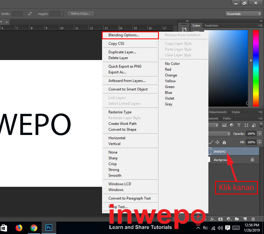 2. Klik kanan pada layer project text / tulisan kamu – klik blending options.