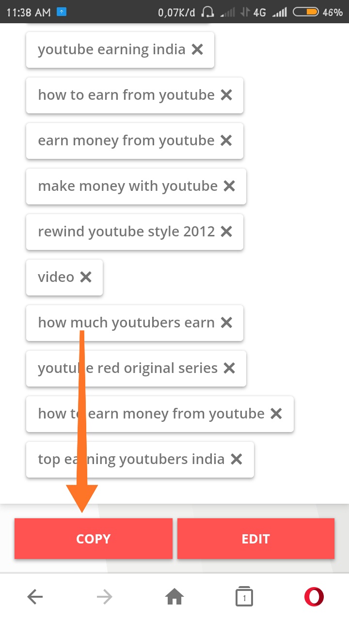 3. Kemudian secara otomatis akan muncul berbagai macam tags yang relevan dengan judul atau kata yang kamu ketik – pilihlah tags yang paling relevan atau sesuai dengan video yang kamu publish di YouTube, dengan cara mengklik ikon silang (X) di samping tags – scroll ke bawah – Tap copy untuk menyalin semua tags yang sudah kamu pilih.