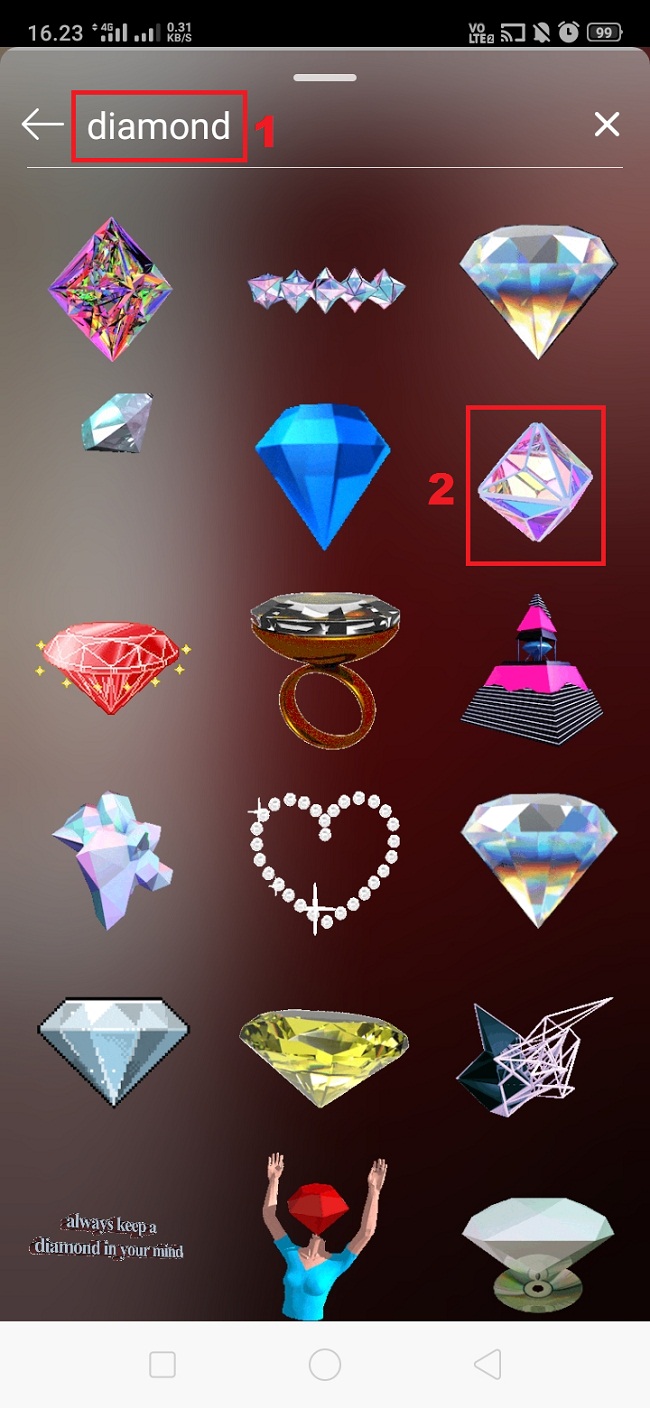 9. Buka kembali fitur instastory, dan cari gambar diamond sebelumnya.