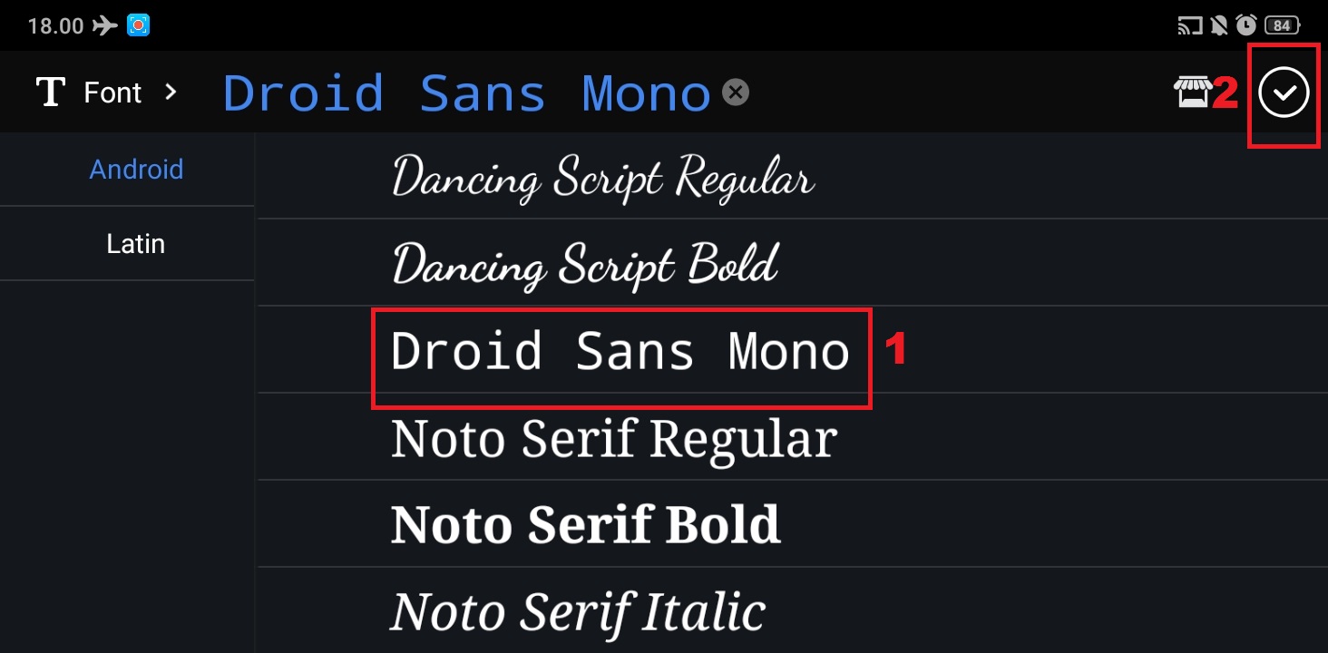 Pilih font, dan pilih centang untuk konfrimasi pemilihan font..