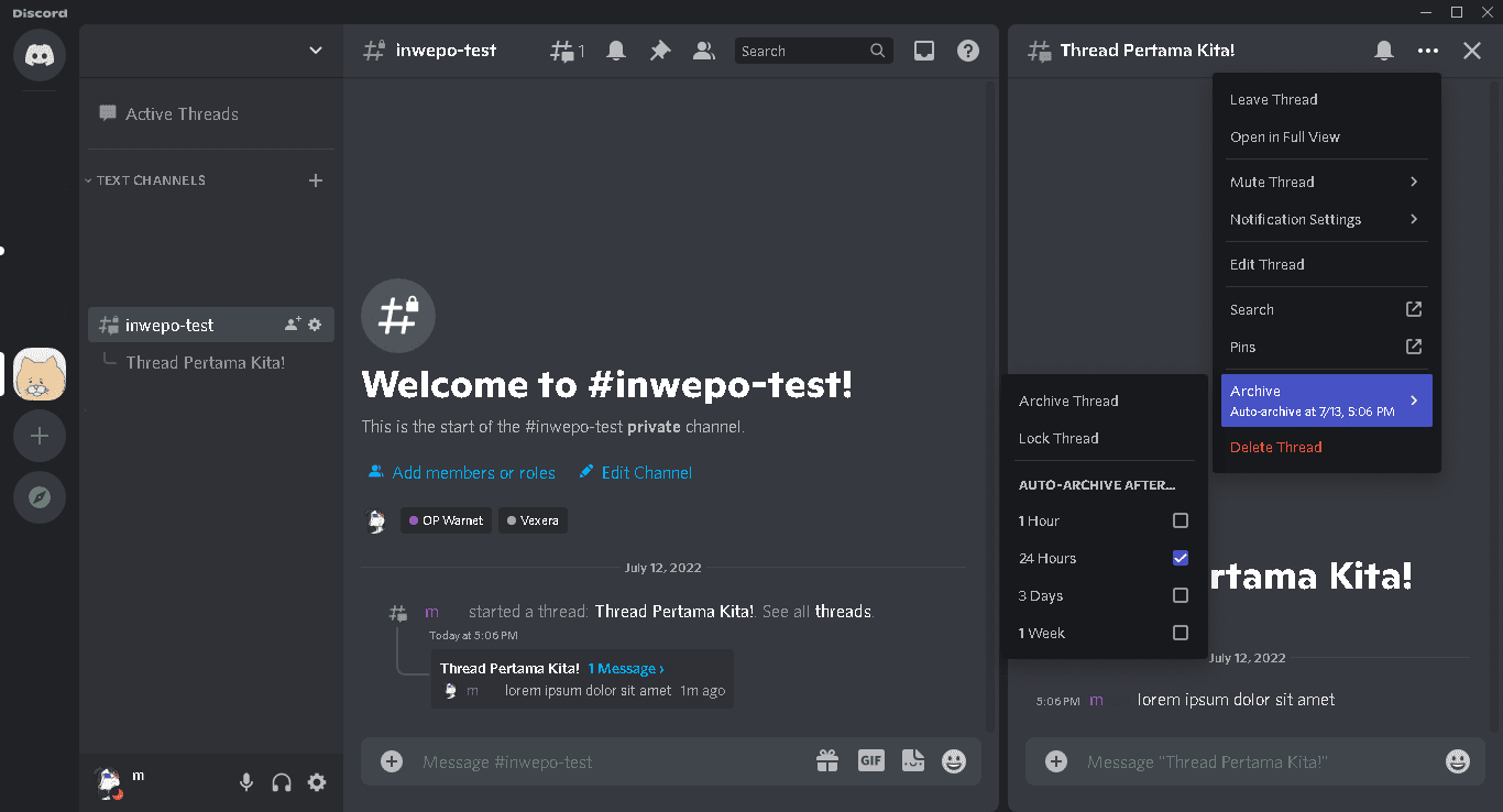 4. Secara default, thread akan diarsipkan setelah tidak aktif (atau tidak menerima balasan chat) selama 24 jam. Sebagai pemilik atau moderator dari server, kamu bisa mengatur waktu pengarsipan sesuai dengan kebutuhan thread. Tidak hanya itu, kamu juga bisa mengunci ataupun menghapus thread yang telah dibuat. Beberapa opsi tambahan seperti menonaktifkan notifikasi pada thread serta mengubah judul dari thread juga dapat diakses oleh pembuat thread serta pemilik atau moderator dari server.