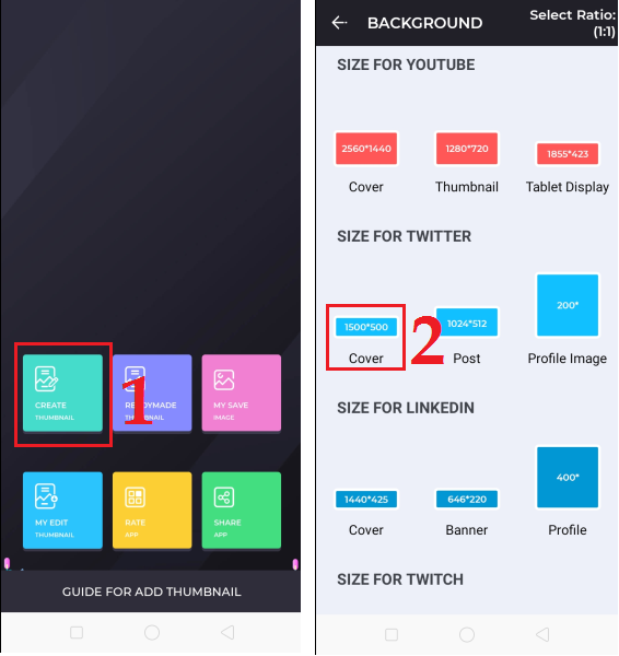 2. Ada dua cara membuat thumbnail dengan menggunakan aplikasi Thumbnail maker, yaitu dengan create dan readymade. Perbedaanya hanyalah terletak pada template-nya saja, pilih create untuk memilih template dari gallery perangkat kamu atau pilih readymade dengan template yang sudah disediakan.