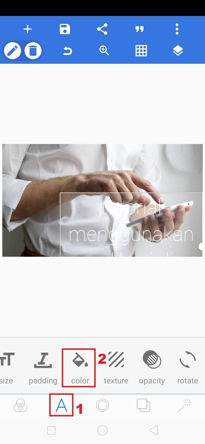 9. Klik ikon ‘A’ – pilih ‘color’ untuk memberi warna pada teks.