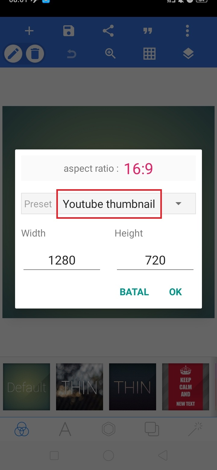 4. Pilih bentuk ‘YouTube Thumbnail’, dan klik ok.