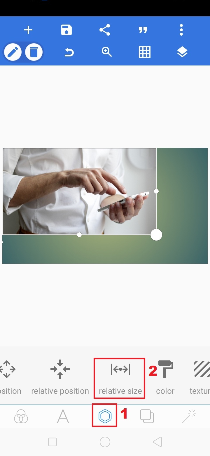 6. Sesuaikan ukuran gambar dengan ukuran background, klik ikon ‘segi enam’ – pilih relative size’.