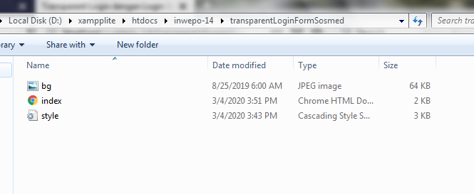 Simpan kode HTLM5 di atas di folder xampplite – htdocs – buat folder baru dengan nama TransparentSosmed – simpan kode di atas dengan nama index.html.