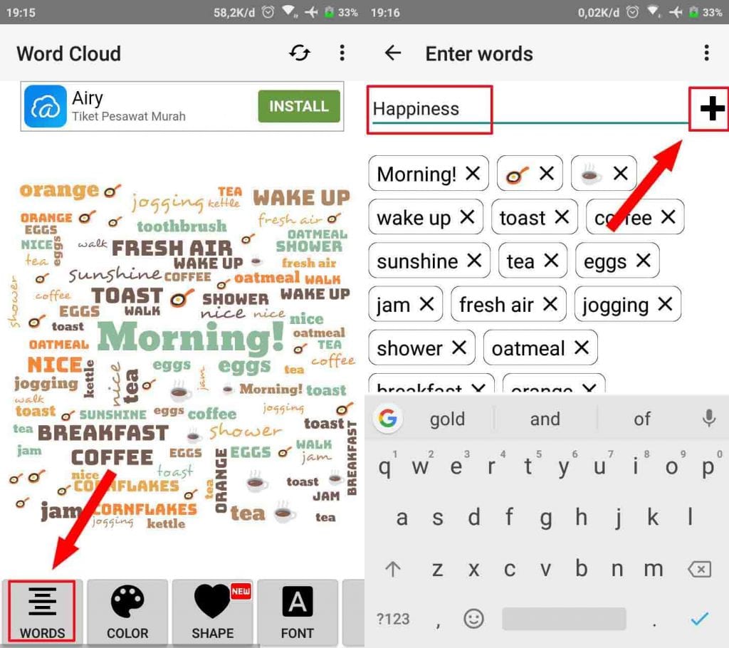 2. Selanjutnya buka aplikasi Word Cloud yang sudah terinstall, tap pada menu WORDS lalu tambahkan kata-katamu sendiri dengan tap icon plus.