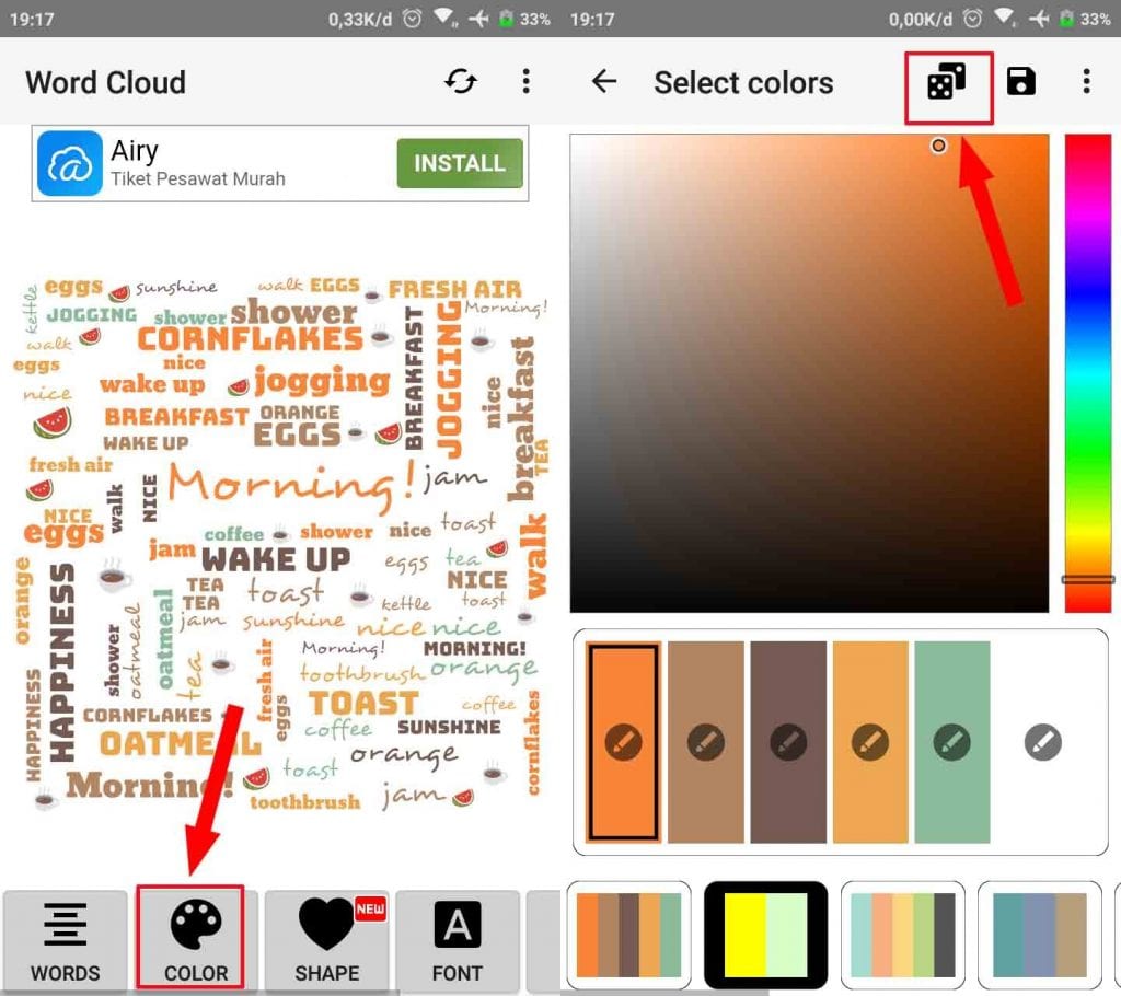 3. Tap pada menu COLOR, untuk mengubah warna sesuai selera kamu. Kamu juga bisa tap pada icon dadu untuk memperoleh warna random atau acak.