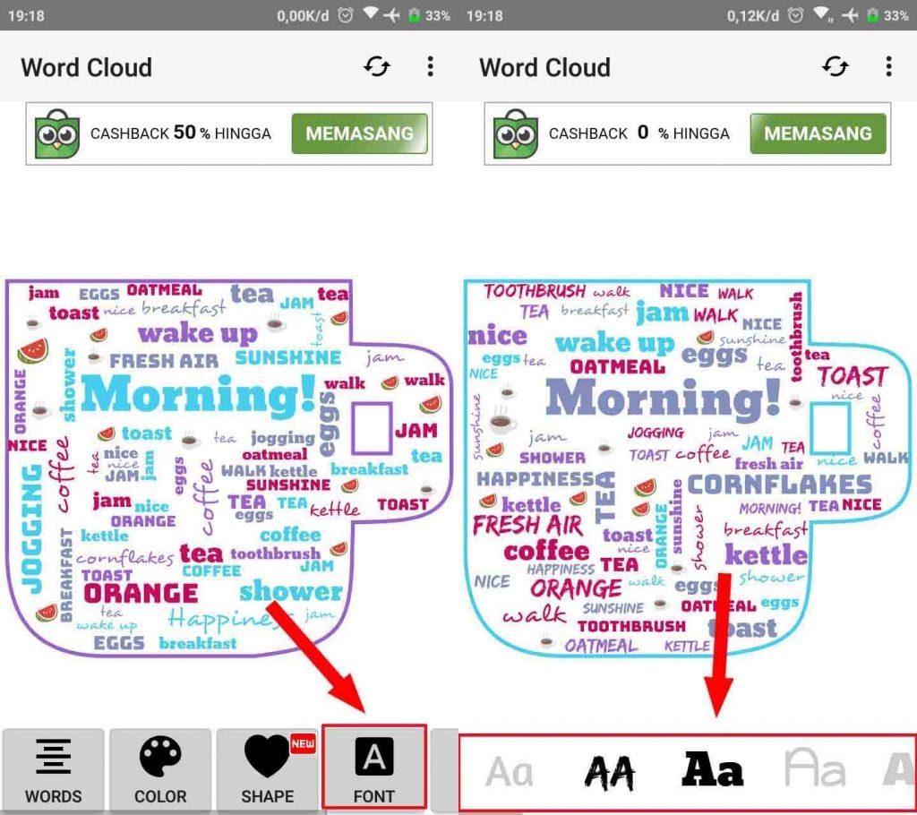 5. Jika sudah selanjutnya tap menu FONT dan ubah bentuk dan gaya tulisan sesuai pilihan kamu.
