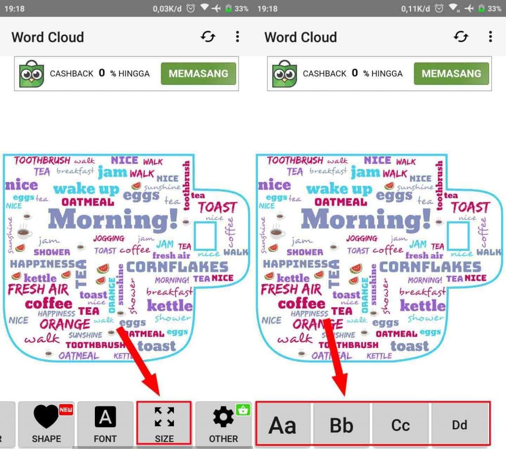 6. Tap SIZE untuk memperbesar dan memperkecil ukuran teks atau tulisan.