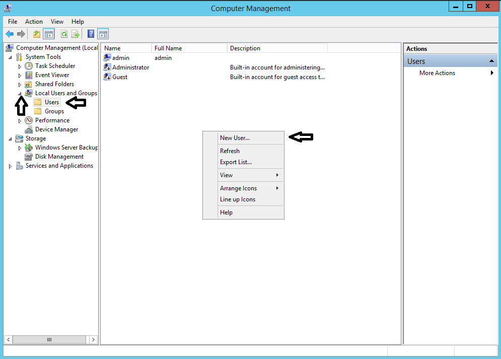 5.Lalu buka tanda panah arah ke kanan , pilih Users lalu klik kanan di sembarang tempat dan pilih New User.