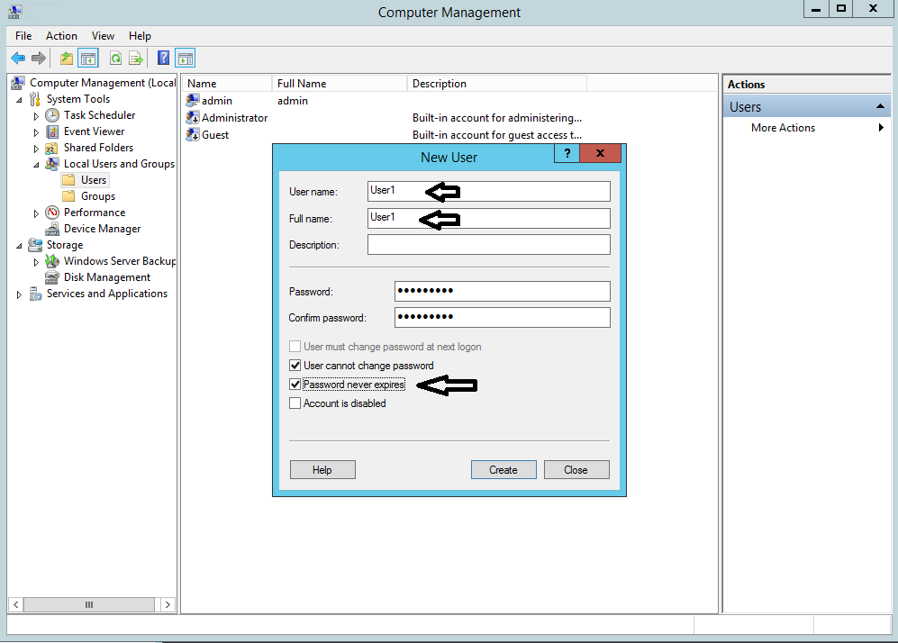 6.Isikan User Name dan Full Name sesuai keinginan, kali ini saya menggunakan nama User 1 lalu buat password sesuai keinginan setelah itu centang kolom Password Never Expires dan pilih Create