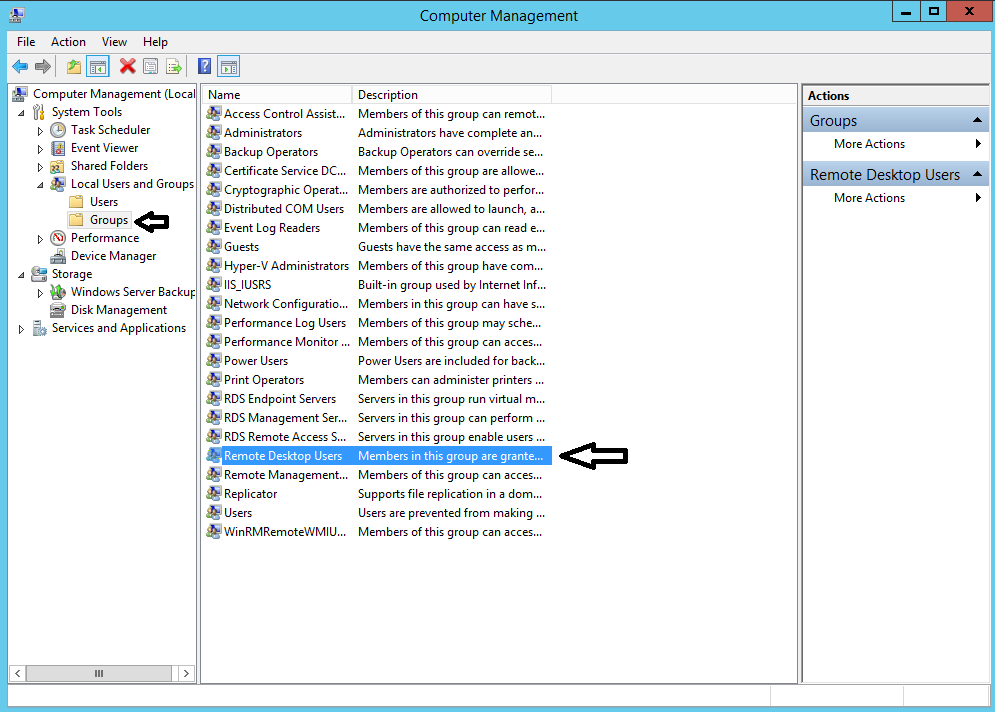 7.Setelah itu pilih Group di sebelah kiri di bawah Users dan klik 2 kali Remote Desktop Users seperti gambar di bawah ini.