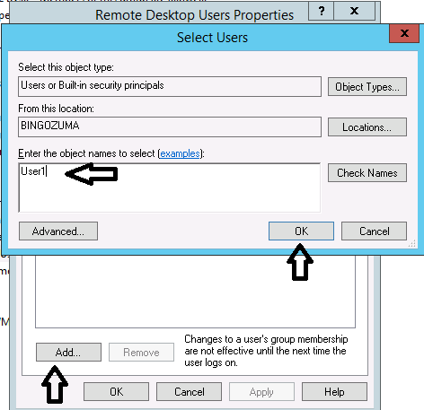 8.Setelah itu klik Add lalu ketik nama User tadi lalu klik OK.