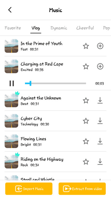 11. Sama seperti efek, diperlukan koneksi internet untuk mendownload musik yang ada. Kamu juga bisa memilih untuk import Music, ataupun mengextractnya dari video. Pilih icon + apabila telah mendapatkan musik yang diinginkan.