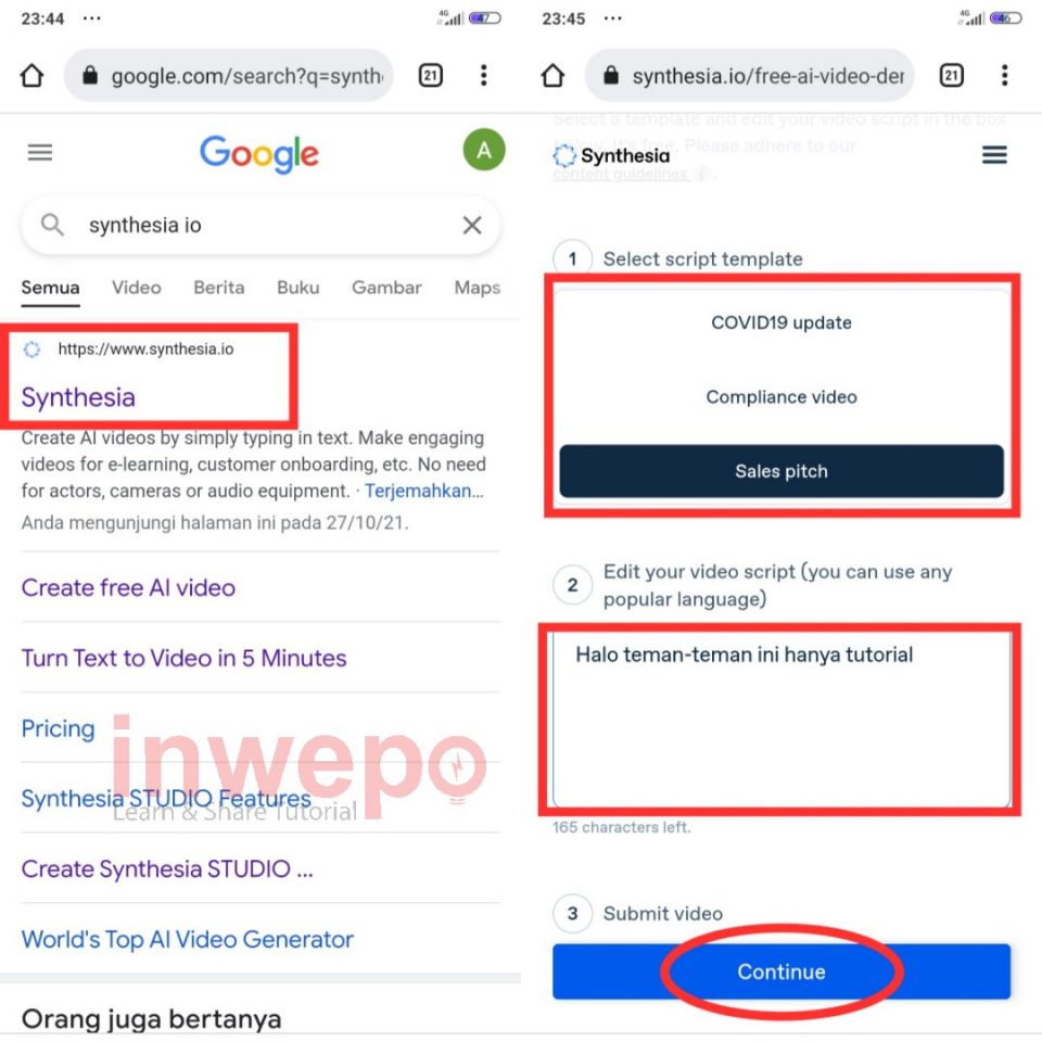 1. Buka aplikasi browser kalian disini saya menggunakan Google Chrome. Selanjutnya cari situs synthesia.io dan masuk ke situsnya. Pilih script template yang ingin kamu gunakan, lalu ketikan kata – kata yang akan di ucapkan pada kolom selanjutnya. Jika sudah tap Continue.