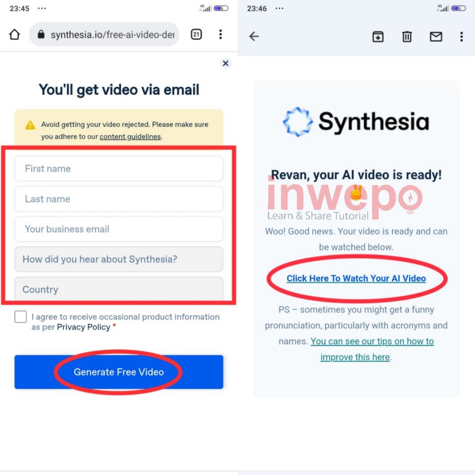 2. Masukkan nama dan alamat emailmu untuk menerima file video dalam email, kemudian tap Generate Free Video. Tunggu beberapa saat dan buka kotak masuk email kamu untuk mendapatkan videonya, tap Click Here to Watch Your AI Video.