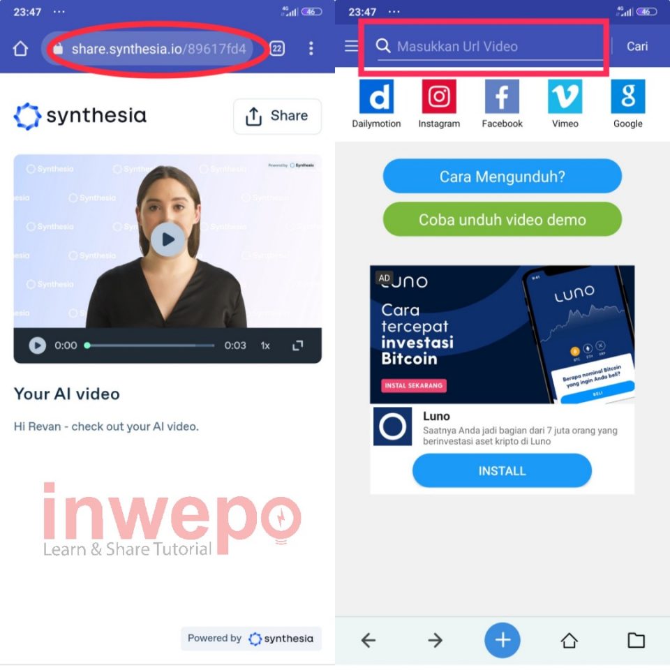 3. Copy link url dari AI Video yang kamu buka, lalu buka aplikasi Download Video From All Website. Masukkan url tadi pada kolom pencarian dan tap Cari.